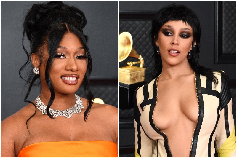 Megan Thee Stallion ise 90’lar enerjisini tercih etti. Dağınık bir balo topuzunu anımsatan saçlarını, kahverengi kalem ile çerçevelenip ıslak görünüm veren bir gloss dokunuşuyla tamamladı. Doja Cat‘e baktığımızda ise dikkatleri ilk çeken şakaklarına dek varan koyu göz makyajı oluyor. Saçlarında ise son dönemin yeniden trend olmaya başlayan mullet modelini görüyoruz.