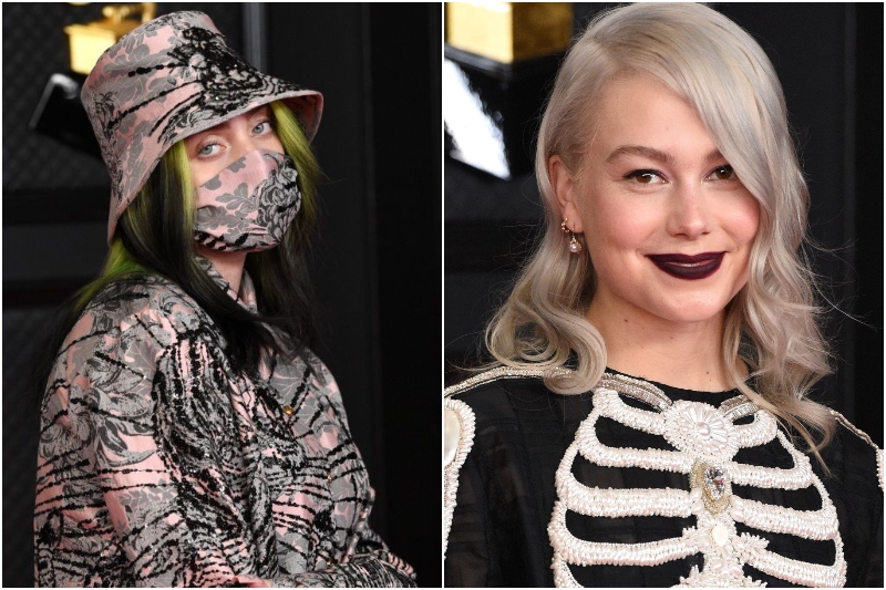 Billie Eilish yine bildiğimiz gibi! Yeşil gölgeler içeren saçlarına kıyafetiyle aynı desende kova şapka takarak ve yine aynı desendeki maskesiyle aksesuarların öne çıktığı bir görünüme sahipti. Phoebe Bridgers, ince çekilmiş eyelinerı ve koyu bordo rujuyla elbisesindeki espriyi vurguladı.