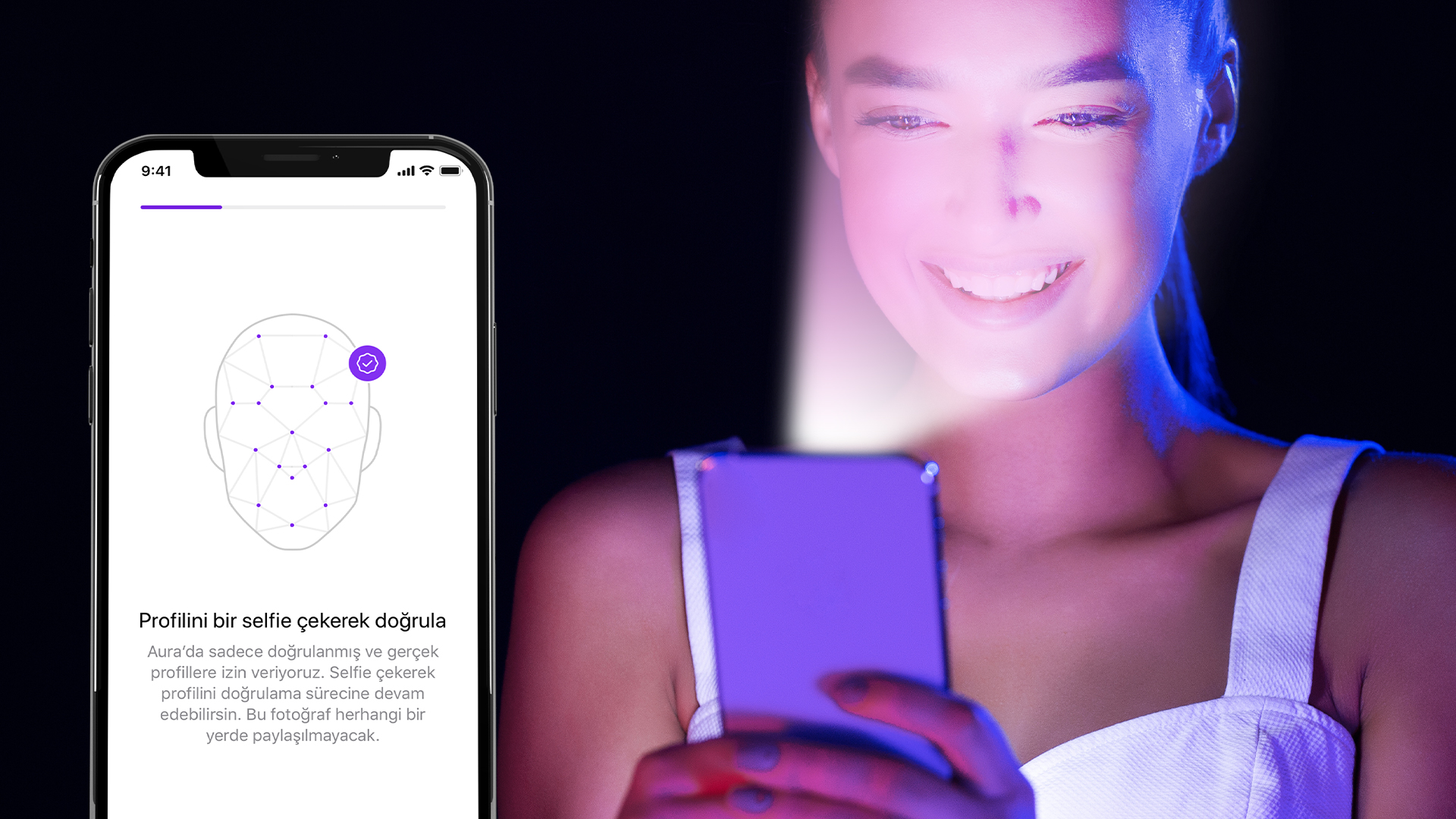 AURA, platforma üye olmak isteyen bütün profilleri, kayıt anında telefonun ön kamerası ile gerçek zamanlı onaylayan alanındaki tek uygulama olma özelliğini de taşıyor. Yüz tanıma teknolojileri kullanarak, doğrulanmış profilleri bizimle buluşturan Aura, bu sayede sadece onaylı ve gerçek profillerden oluşan son derece güvenli bir ortam sağlamayı hedefliyor.