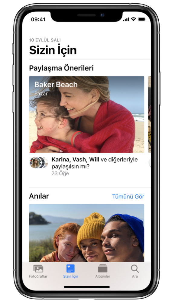 Akıllı yüz tanıma ve konum belirleme özellikleri, fotoğrafta birlikte yer aldığınız kişilere veya fotoğrafın çekildiği konuma göre arama yapabilmenizi sağlıyor ve tam da aradığınız fotoğrafı bulmanızı kolaylaştırıyor. Fotoğraflar uygulaması, resimlerinizdeki yerleri ve nesneleri tanımlayarak bunları kolayca aramanıza imkan tanır. Örneğin, “plaj”, “doğum günü pastası” ya da “annem” gibi kelimeler girerek arama yapabilirsiniz.