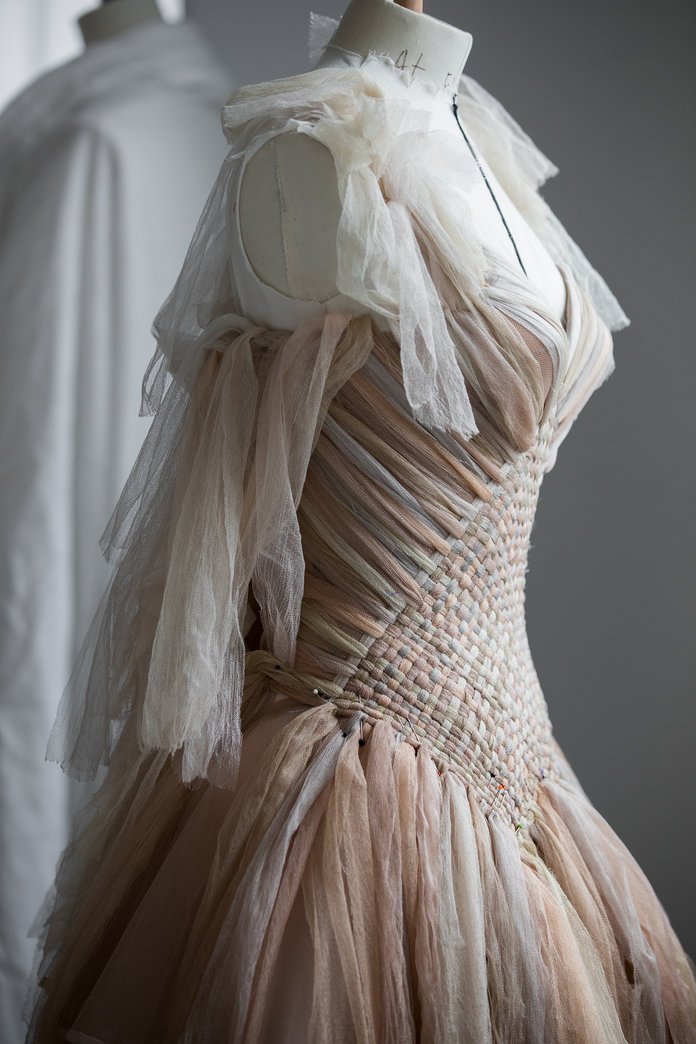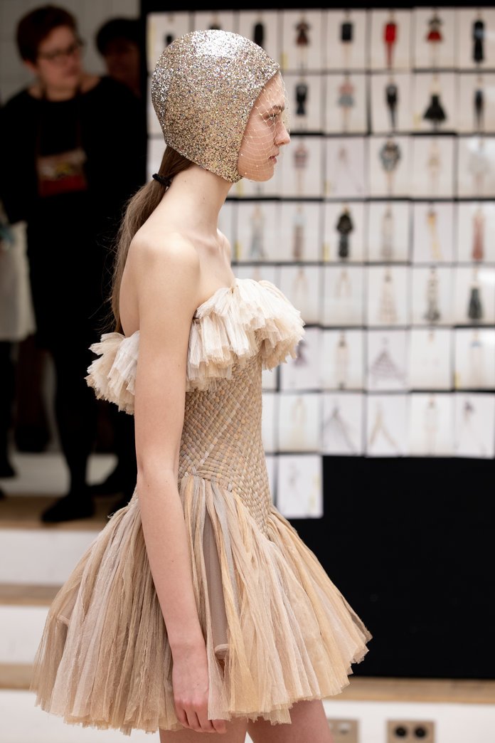 Koleksiyonda özellikle dikkat çeken bir tasar?m vard?: Sepet ?eklinde dokunmu? bir elbise. Bu tasar?m tek tek boyanm?? ipek tül ?eritlerle olu?turuldu. Marka, bu kaliteli tüllerle i?lenmi? özel elbisenin yap?m?n?n 450 saatlik çal??ma sonucunda tamamland???n? aç?klad?.