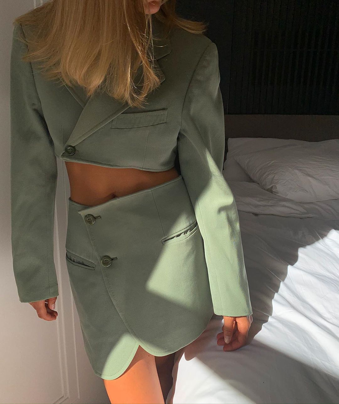 Klasik etek-ceket takımları unutun. Sanki bir ceket elbiseyi ortadan ikiye kesip takım haline getirmiş gibi görünen bu takım elbiseler sezonun son trendini oluşturuyor.