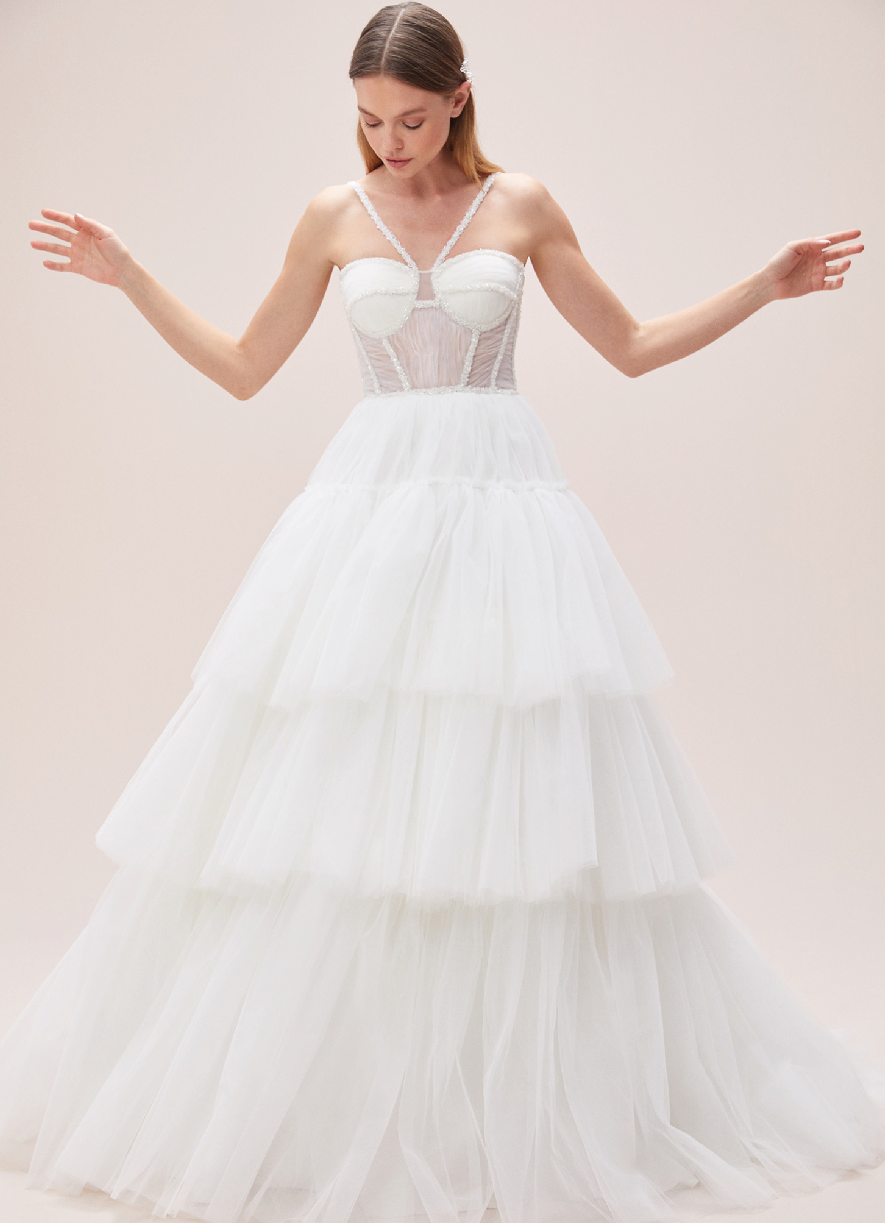 2020 gelinlik koleksiyonunda yer alan ve 70’lerin ruhunu günümüze yansıtan kat kat etekli gelinlikler, günümüz prenseslerine modern bir görünüm getiriyor. Katların hareket kattığı dökümlü tüller, incecik danteller ve yalın satenler, gelinliklerde özgün bir tasarıma dönüşüyor.