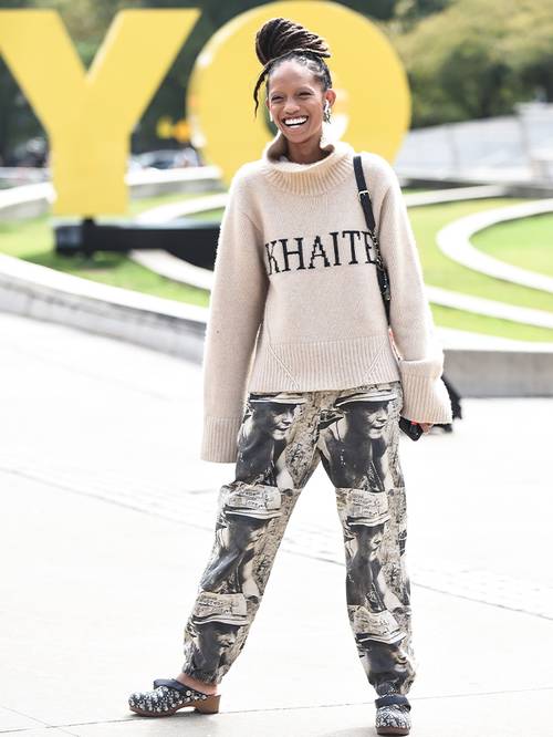 Chanel, Dior, Louis Vuitton gibi markaların defilelerinde yürüyen Adesuwa Aighewi; Dior saboları ve Khaite balıkçı yaka kazağı bir araya getirmesinden de anlaşılacağı gibi rahatlığın ön planda olduğu deneysel bir stile sahip.