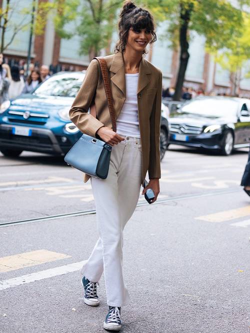 Louis Vuitton, Chanel gibi markaların defilelerinde gördüğümüz Louis Vuitton, Chanel, klasik mavi denim pantolonu, iddialı parçalarla tamamlamayı seviyor.