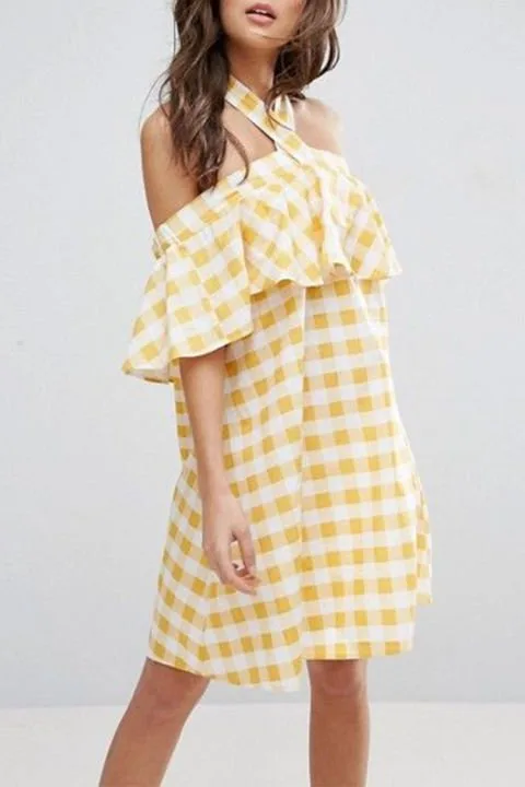 Omuzları açık elbise trendinin hiçbir yere gittiği yok. Fırfır detayı ise işe ekstra eğlence katıyor.  Asos