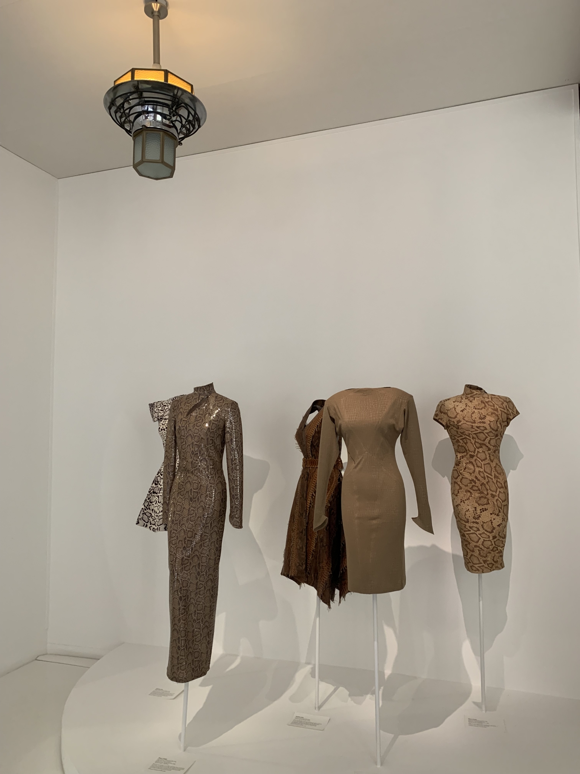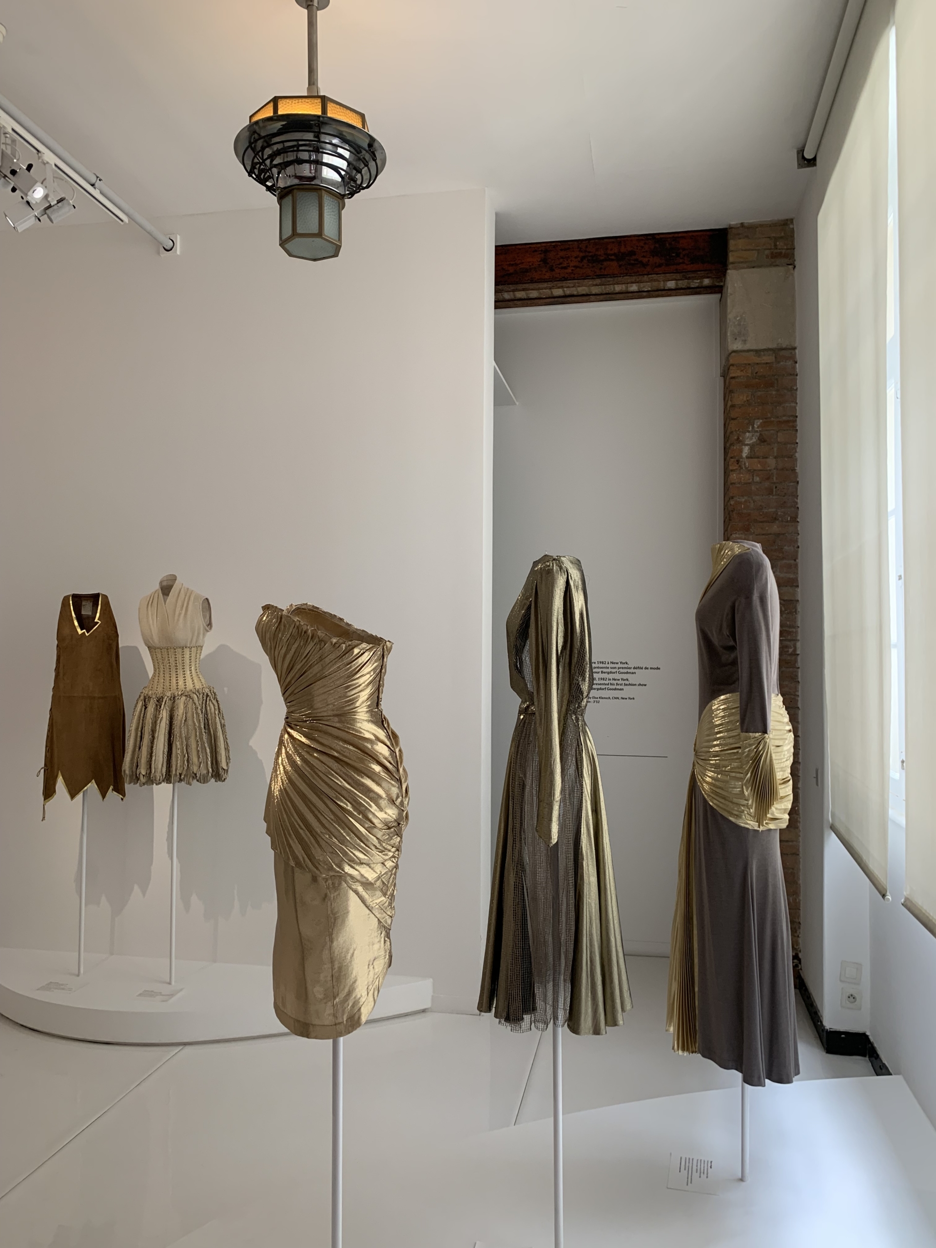 Sergide gördüğüm 40 Thierry Mugler parçası Alaia’nın kendi arşiviyle diyaloğa girerek moda tarihindeki en özel arkadaşlıklardan birine tanıklık etmemizi sağlıyor. Yan yana duran siluetler Mugler’in bir vinil (parlak ve plastik benzeri bir görünüm) korsesi ile Alaia’nın el yapımı streç elbisesinin yanında yer alıyordu.