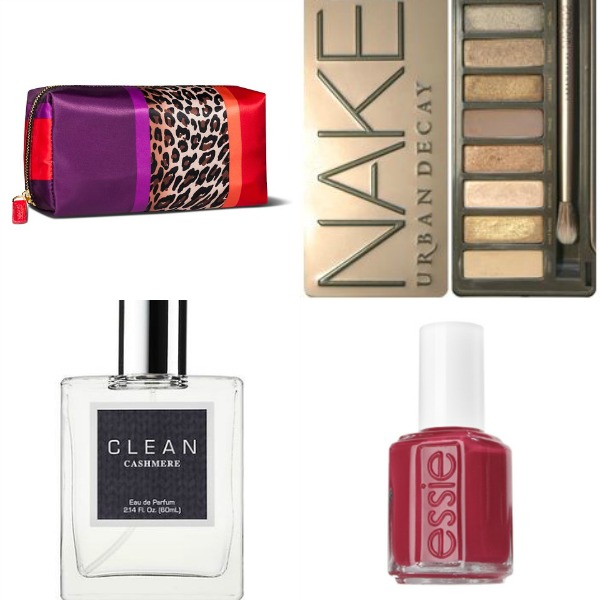 Sonia Kashuk Cheetah Makeup Organizer, $10, target.com; Urban Decay Nasked2 Basics, $29, sephora.com; Essie Nail Color in Garnet, $8.50, essie.com; Clean Cashmere Eau de Parfum, $69, sephora.com.