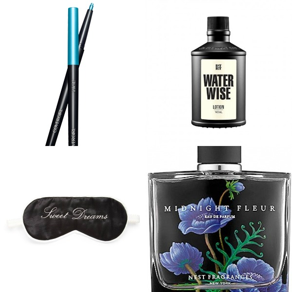 Fleur’t Embroidered Eye Mask, $20,nordstrom.com; Covergirl Ink It! Perfect Point Plus Eyeliner in Aquamarine Ink, $6.50,drugstore.com; DTRT Water Wise Lotion, $32, sephora.com; Nest Fragrances Midnight Fleur, $68, sephora.com.