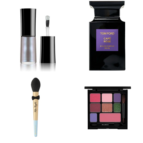 Shu Uemura x Yazbukey I Love My Shu Shu Eye and Cheek Palette, $51.75, shuuemura-usa.com; Too Faced Mr. Right Perfect Powder Brush, $36, toofaced.com; Giorgio ArmaniNail Lacquer in 702, $20, barneys.com; Tom Ford Café Rose Eau de Parfum, $220,nordstrom.com.
