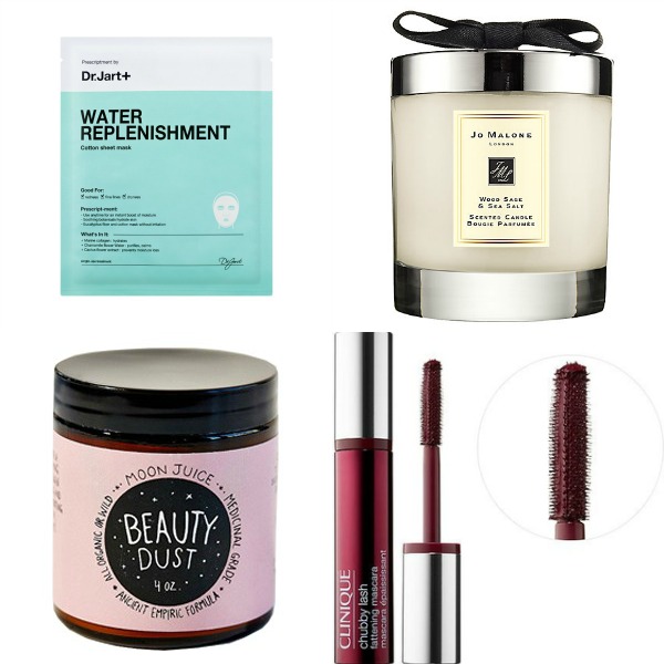 Dr. Jart+ Water Replenishment Mask, $7.50,sephora.com; Jo Malone Wood Sage & Sea Salt Candle, $65, nordstrom.com; CliniqueChubby Lash Fattening Mascara in Bodacious Black Honey, $17, sephora.com; Moon JuiceBeauty Dust, $65, moonjuiceshop.com.