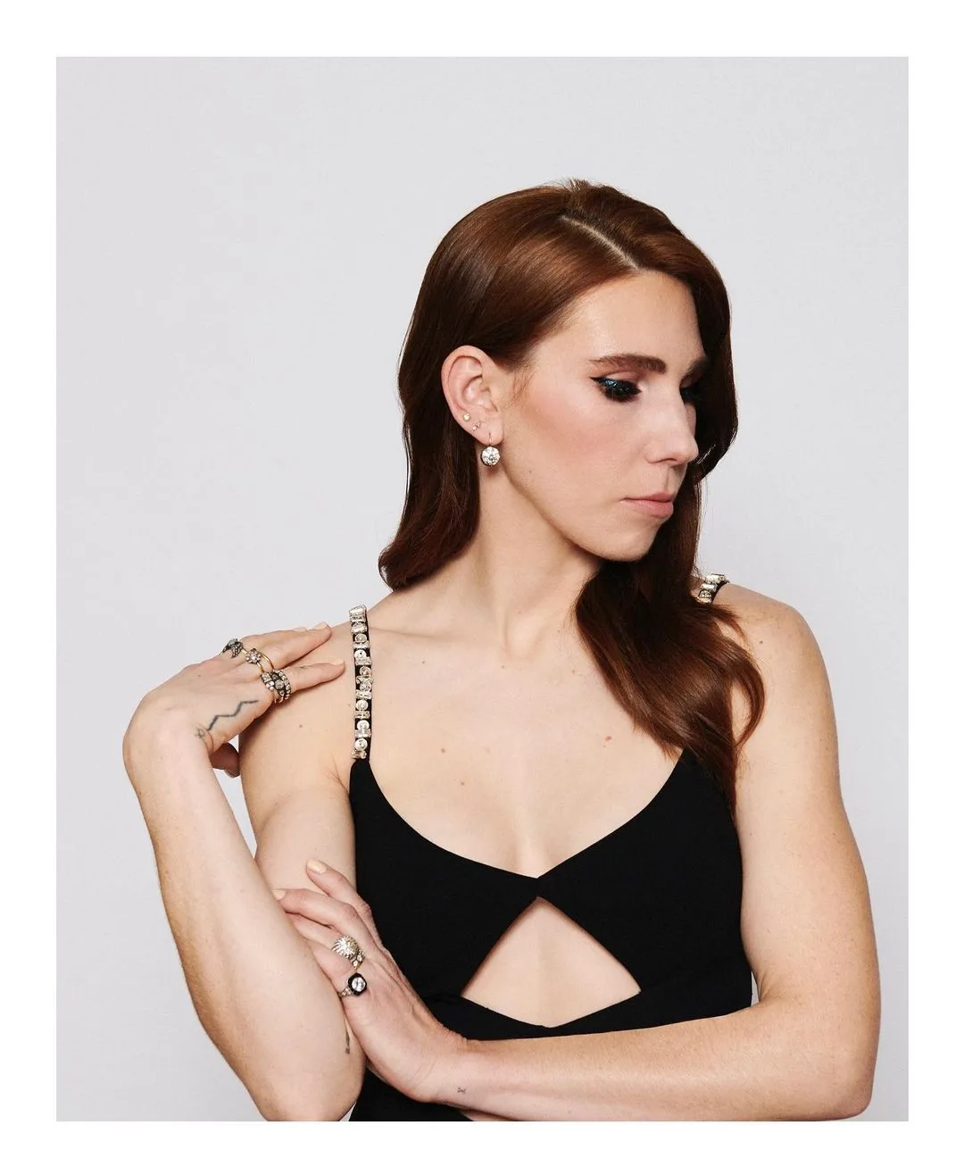 Duru güzelliğiyle dikkat çeken Zosia Mamet, yandan ayırdığı saçlarına göz makyajının yıldız olduğu bir görünümle eşlik etti. Lacivert ışıltılı eyeliner görünümü, oldukça modern ve şık bir görünüm yarattı.