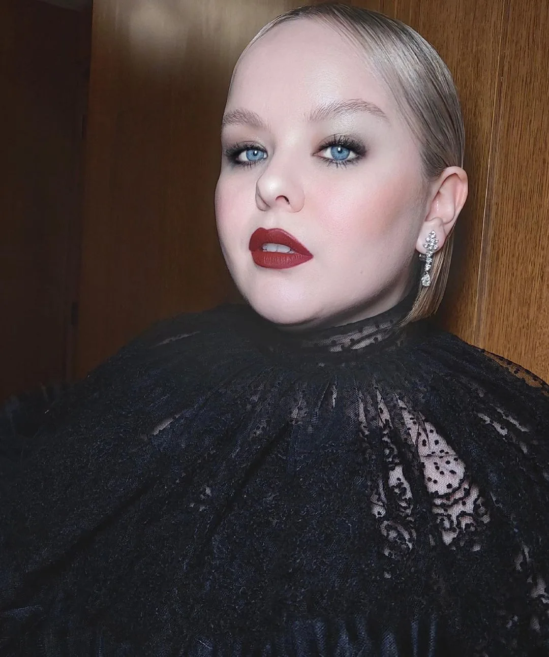Bridgerton yıldızı Nicola Coughlan, gotik kıyafeti ve makyajıyla dikkat çeken görünümlerden birini sergiledi. Siyah ve gri yoğunluktaki göz makyajını, bordo rujla tamamladı. Saçlarında ise düz keskin bir model tercih etti.