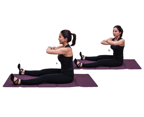 Bacaklarınızı mat genişliğinde açın. Sırtınız ve boynunuz dümdüz bir çizgi olacak şekilde oturma kemiklerinize oturun. Kollarınızı göğüs hizasında çapraz yapın (a). Karın kaslarınızı sıkın. Nefes alın, nefes verirken gövdenizin pozisyonunu bozmadan gövdenizi sağa döndürün (b). Başlangıç pozisyonuna geri dönün, diğer tarafa dönerek tekrar edin. Hareketi 20 defa tekrarlayın.