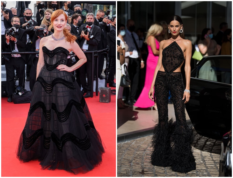 74. Cannes Film Festivali’nin siyahlar içindeki iki ismiyle başlıyoruz. Jessica Chastain, Christian Dior Haute Couture bir straplez elbise tercih ediyor. Bir takım ile gördüğümüz ünlü model Izabel Goulart ise bir Etro tasarımına başvuruyor.