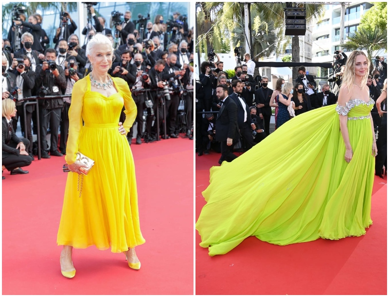 Biraz da renk! Helen Mirren güneş sarısı Dolce & Gabbana elbisesiyle kırmızı halıda adeta ışıldıyor. Chiara Ferragni ise etkinliğe bir Giambattista Valli tasarımıyla katılıyor.
