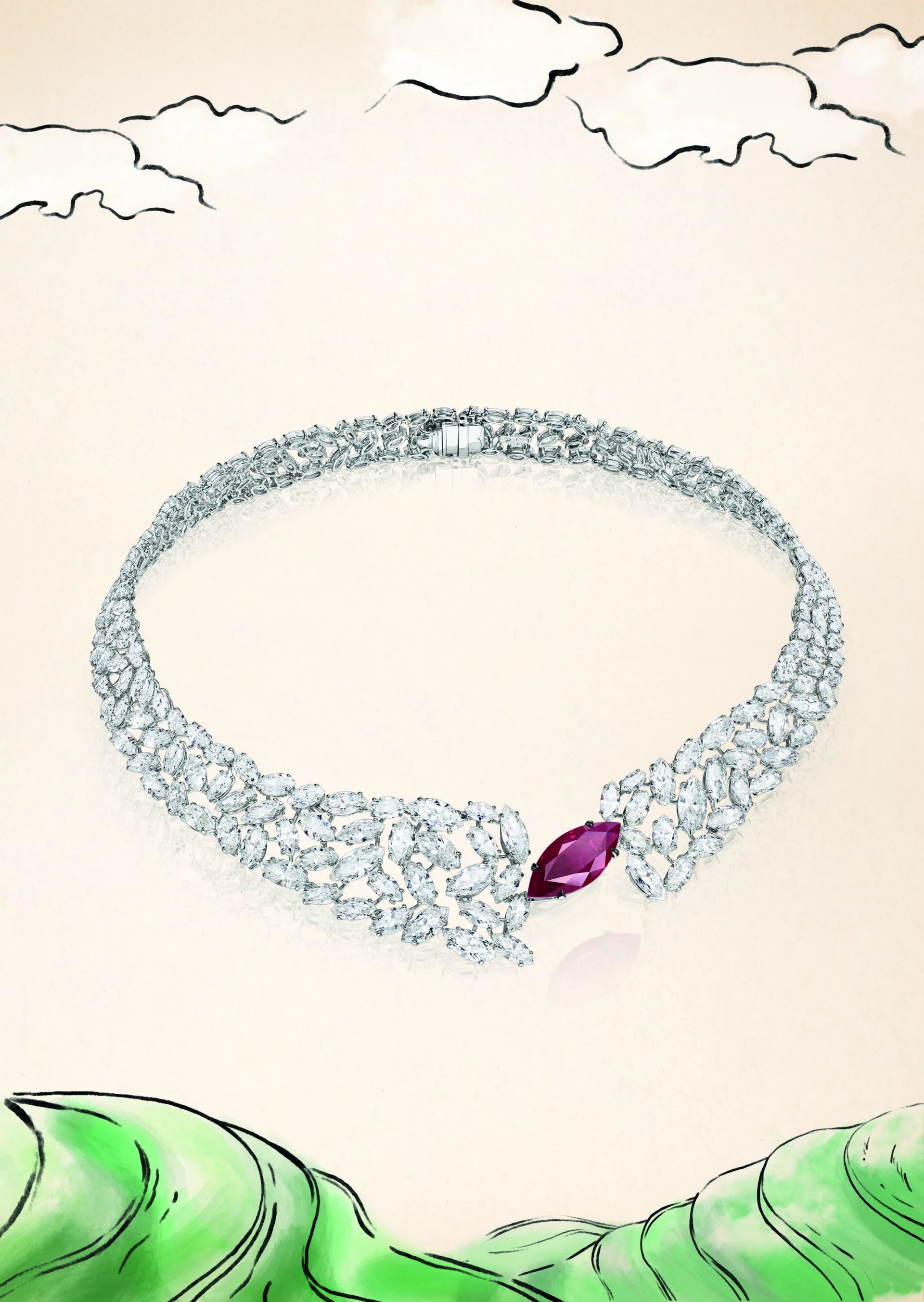 Longsheng adlı kolye, beyaz altın üzerine, 7.26 karat markiz kesim bir Burma yakutu, 53.85 karat 210 adet markiz pırlanta ve 0.38 karat 76 adet pırlantadan oluşuyor.