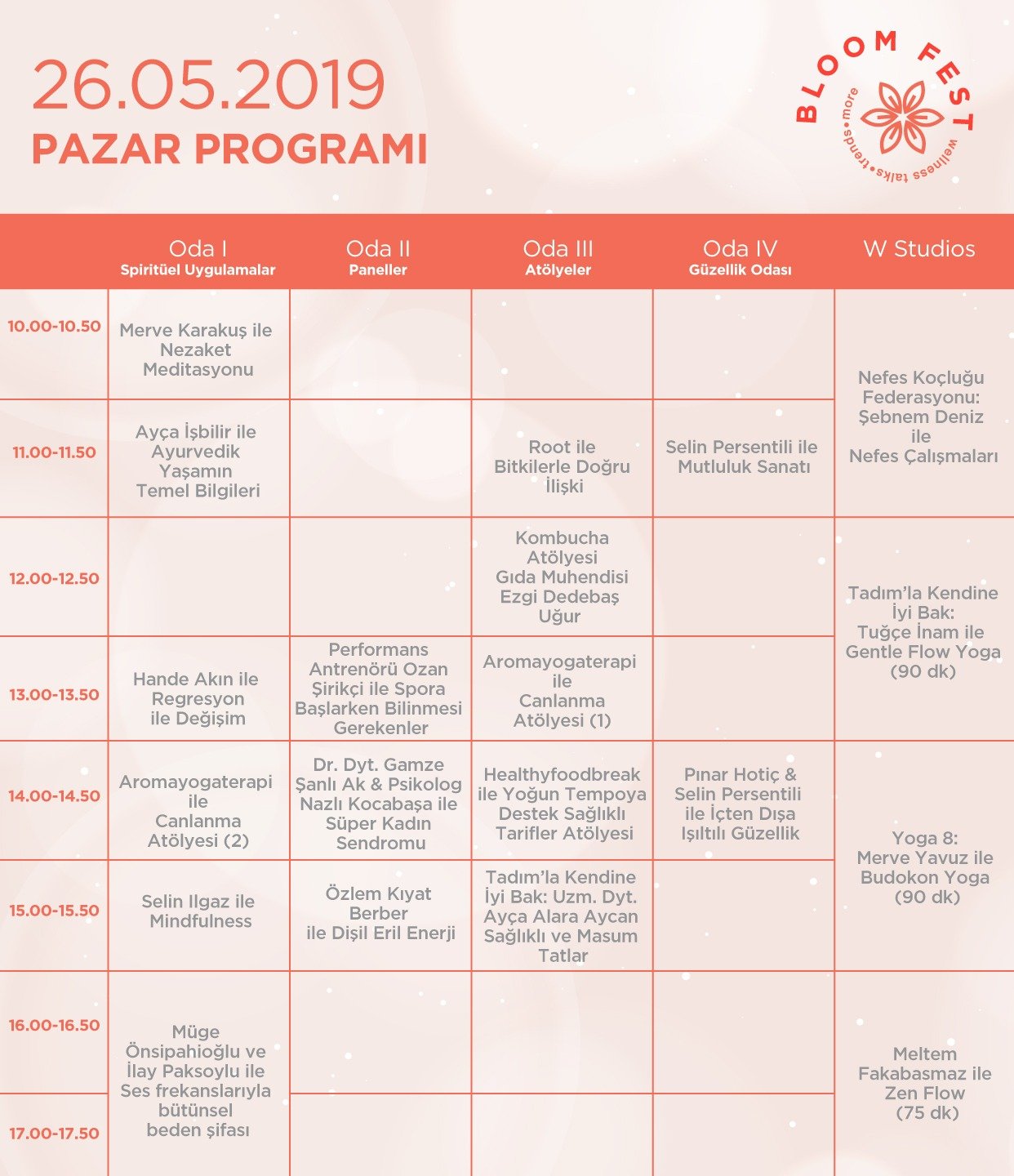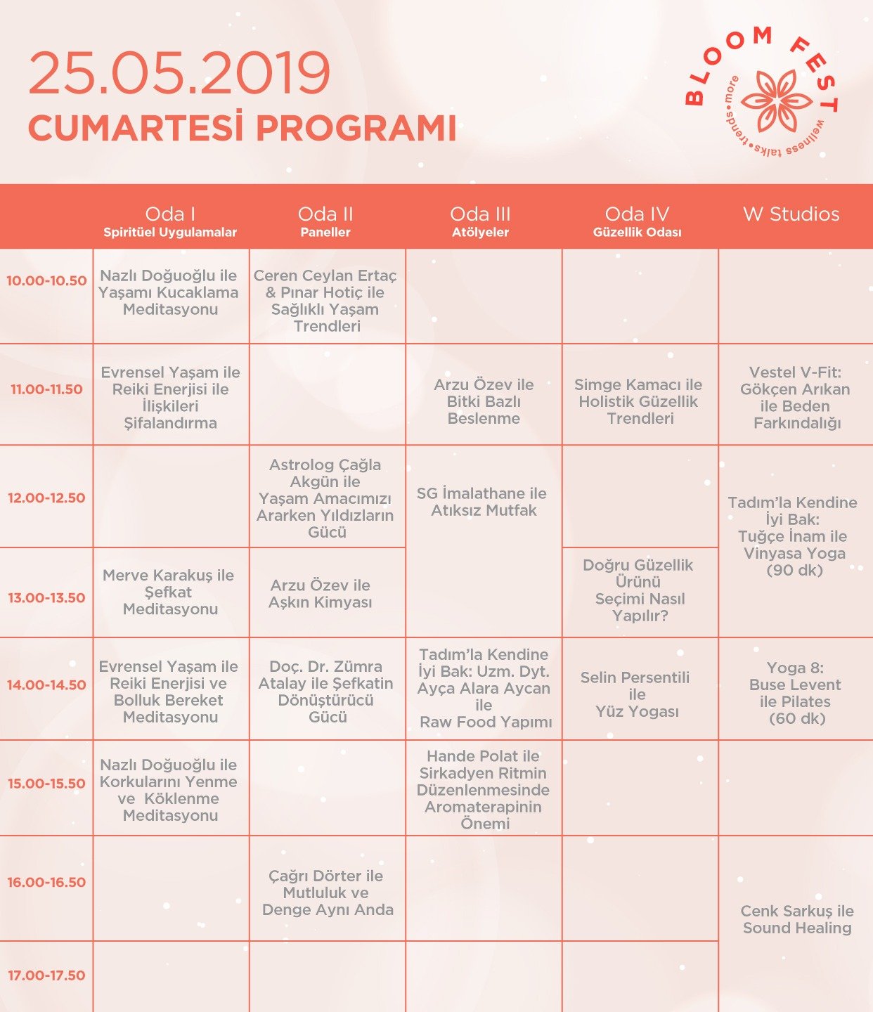 “Daha iyi bir yaşam” hedefleyenler için wellness konseptinin tüm detaylarıyla işleneceği BloomFest’te; meditasyon, nefes teknikleri, sağlıklı beslenme, kişisel gelişim, doğal güzellik, yoga, mindfulness, sound healing, reiki ve astroloji alanlarında uzman isimler, katılımcılara yenilenme ve arınmanın rahatlatıcı etkisini yaşatmayı planlıyor.