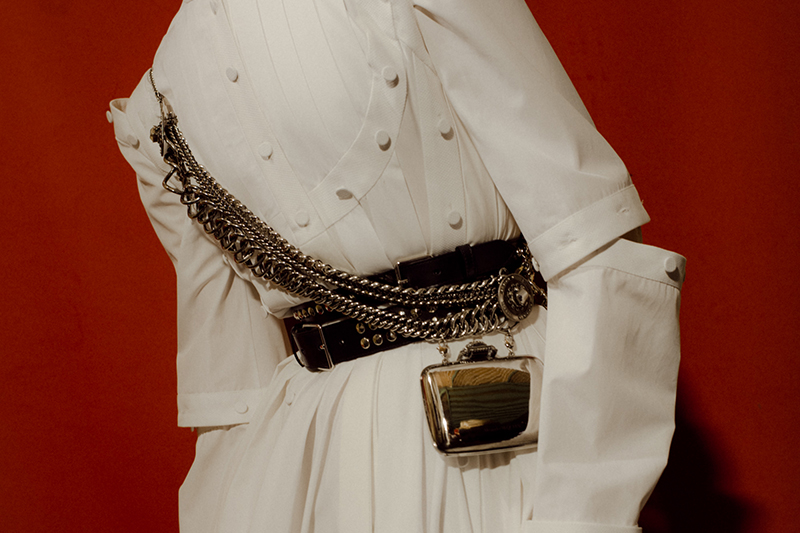 Uzun zincir askısıyla dikkat çeken Alexander McQueen Mini Clutch, Kuzey İngiltere’deki tekstil fabrikalarındaki makineler ve endüstriyel yapılardan ilham alıyor. Çanta üzerindeki çizgiler, makinelerin mekanik yüzeylere atıfta bulunuyor.