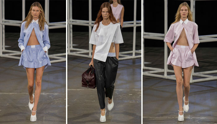 Alexander Wang, 2014 – 2015 İlkbahar – Yaz sezonuyla birlikte erkek arkadaşınızın gömleklerini giymenize gerek kalmayacağının habercisi. Balenciaga için sofistike kadınların gardırobuna hitap eden tasarımcı, kendi koleksiyonunda yine sportif çizgisini bozmadan yola devam ediyor. Deri pantolonlar ve bluzların ağırlıklı olduğu defilede yüksek belli şortlar ve plili etekler başrolü üstleniyor. [imagebrowser id=1032]