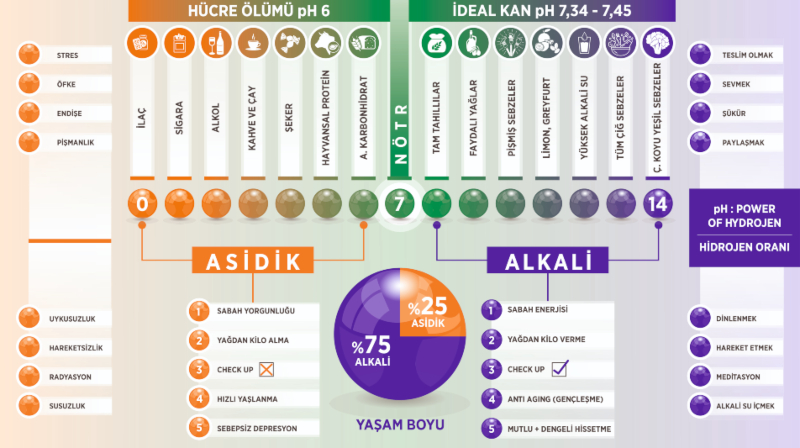 Asidik yiyecekleri sınırlamak hatta beslenmemizden tamamen çıkartmak vücudumuzun pH grafiğini alkalide tutmak için ilk adımlardan biridir. Alkali diyet, vücudunuzla doğal olarak çalışan, olası sağlık sorunlarınızı önleyebilecek ya da gerçekleşmiş sağlık sorunlarının etkilerini en aza indirebilecek bir beslenme ve yaşam biçimidir.