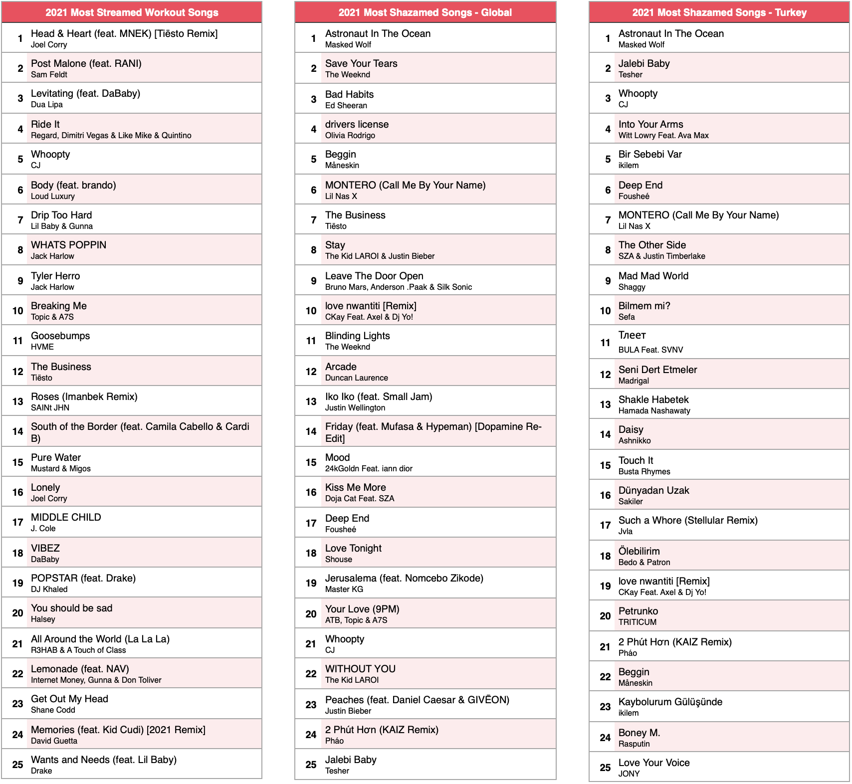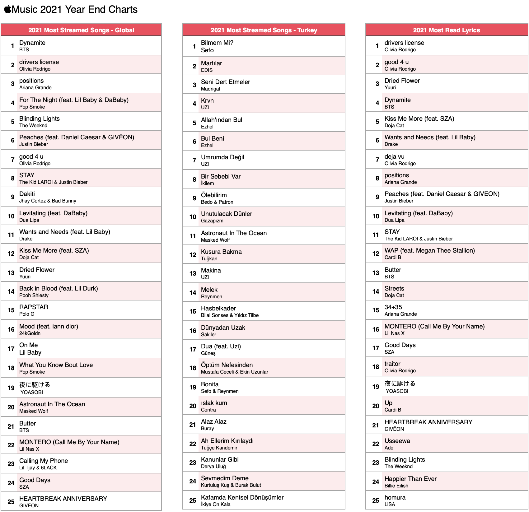 Apple Music dünya listelerinde 2021’in en çok dinlenen şarkısı BTS’den” Dynamite” olurken Türkiye listelerinde ilk sırada Sefo’dan “Bilmem Mİ?” şarkısını EDİS’den “Martılar” ve Madrigal’den “Seni Dert Etmeler” parçası takip ediyor. 2021’in en çok Shazamlanan parçası ise hem dünya hem Türkiye listelerinde Masked Wolf’tan “Astronaut in the Ocean” olarak karşımıza çıkıyor.