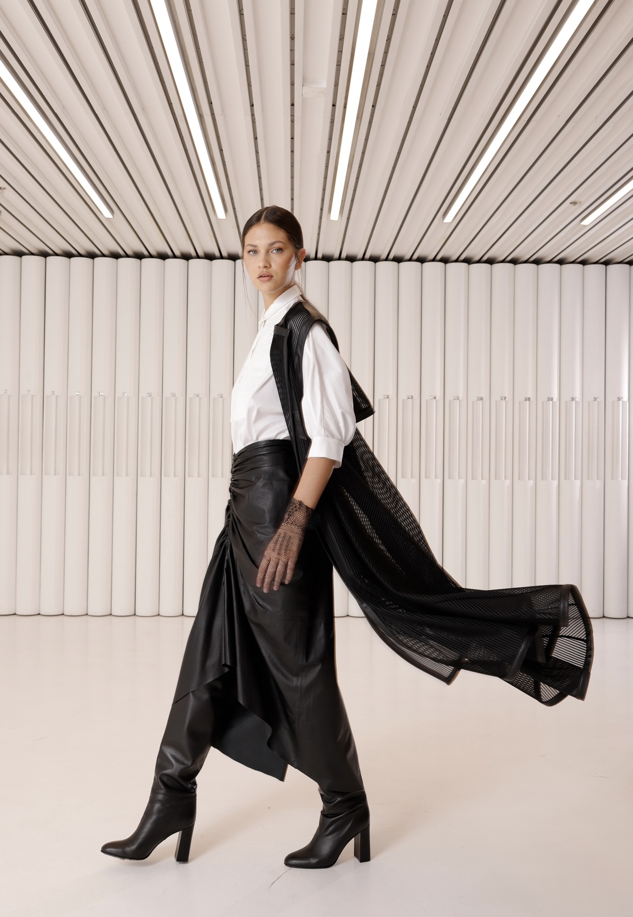 Türkiye ve dünyada sürdürülebilir moda alanında gerçekleştirdiği projelerle sıkça adından söz ettiren Arzu Kaprol’un “Humand” isimli koleksiyonunda sadece “iyi” kumaş kullanımları dikkat çekiyor. Yün, ipek, vegan ipek, deri ve pamuk ile teknolojik kumaşların birlikte kullanıldığı koleksiyon, moda severleri yapay zekanın sonsuz dünyasında yaratılan ve insani dokunuşlarla eşsizleştirilen desenlerin canlı renkleriyle buluşturuyor.