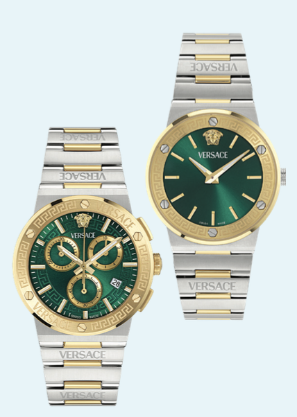 Versace, Greca Logo koleksiyonunda kadın modeli aerodinamik siluetiyle özgür ve zarif, erkek modeli 40 mm kasa ile sofistike bir duruş sergiliyor.