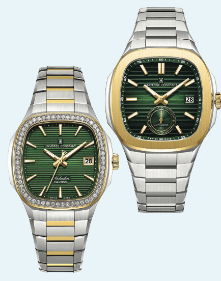 Universe Constant Nebulon kadın modeli 34 mm yuvarlatılmış kare kasa ve pırlanta detayla gelin stiline incelik katıyor, erkek modeli 41 mm kasa ve Sellita SW261 otomatik mekanizma güçlü bir duruş sunuyor.