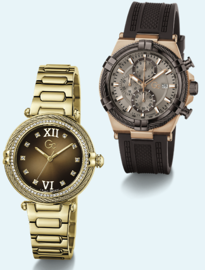 Gc Vogue Cable kadın saati 37 mm kasa ve taş detaylı kadranıyla gelin stiline sofistike dokunuş katıyor, IronForce erkek saati 44 mm rose gold kasa ve sportif çizgilerle damat stilini tamamlıyor.