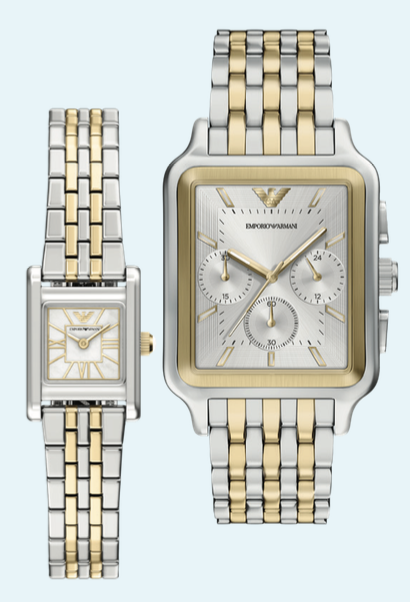 Emporio Armani kadın 26 mm kare kasa ve sedef kadran ile zarafet sunarken, erkek 38 mm dikdörtgen kasa ve iki tonlu çelik bilezik zamansız bir stil sağlıyor.