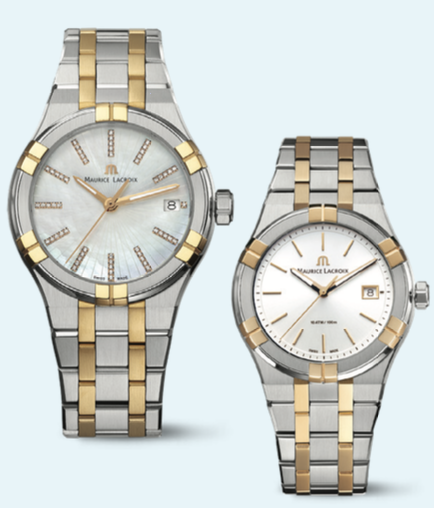 Maurice Lacroix Aikon kadın saati 35 mm pırlanta detaylı kasa ve altın- metalik gri bilezikle ışıldıyor, erkek modeli 40 mm kasa ve metalik gri tonlar modern duruş sağlıyor, Ronda 515 mekanizma hassasiyet sunuyor.
