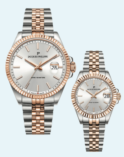 Jacques Philippe Adastra koleksiyonunda kadın saati 32 mm çelik kasa ve safir cam sade ama etkileyici, erkek saati 40 mm kasa ve rose gold detaylı bilezik modern damat stiline rafine karakter katıyor.