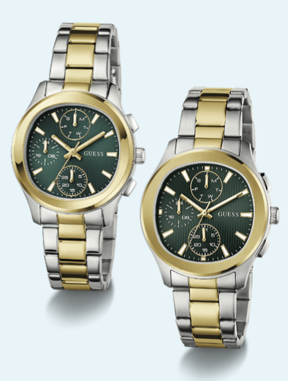 GUESS Birdie kadın saati 36 mm yuvarlak kasa ve yeşil kadran ile narin bir duruş, erkek saati 40 mm kare kasa ve yeşil kadran ile güçlü ve modern stil sunuyor.