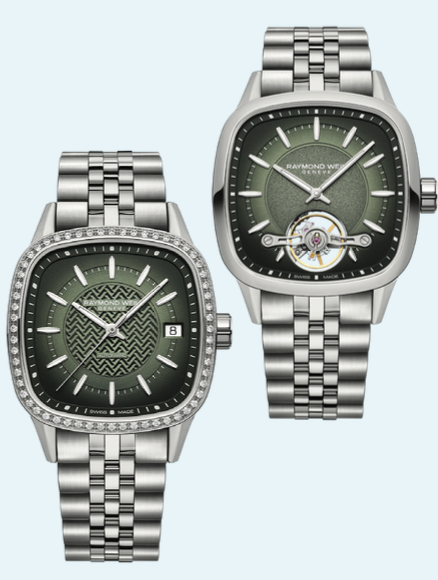 Raymond Weil Toccata Heritage koleksiyonunda kadın saati 31×36 mm yuvarlatılmış dikdörtgen çelik kasa ve pırlanta bezel ile zarafeti yansıtıyor, erkek saati 33×38 mm kasa ve kurmalı RW4100 mekanizmasıyla kararlı bir duruş sergiliyor.