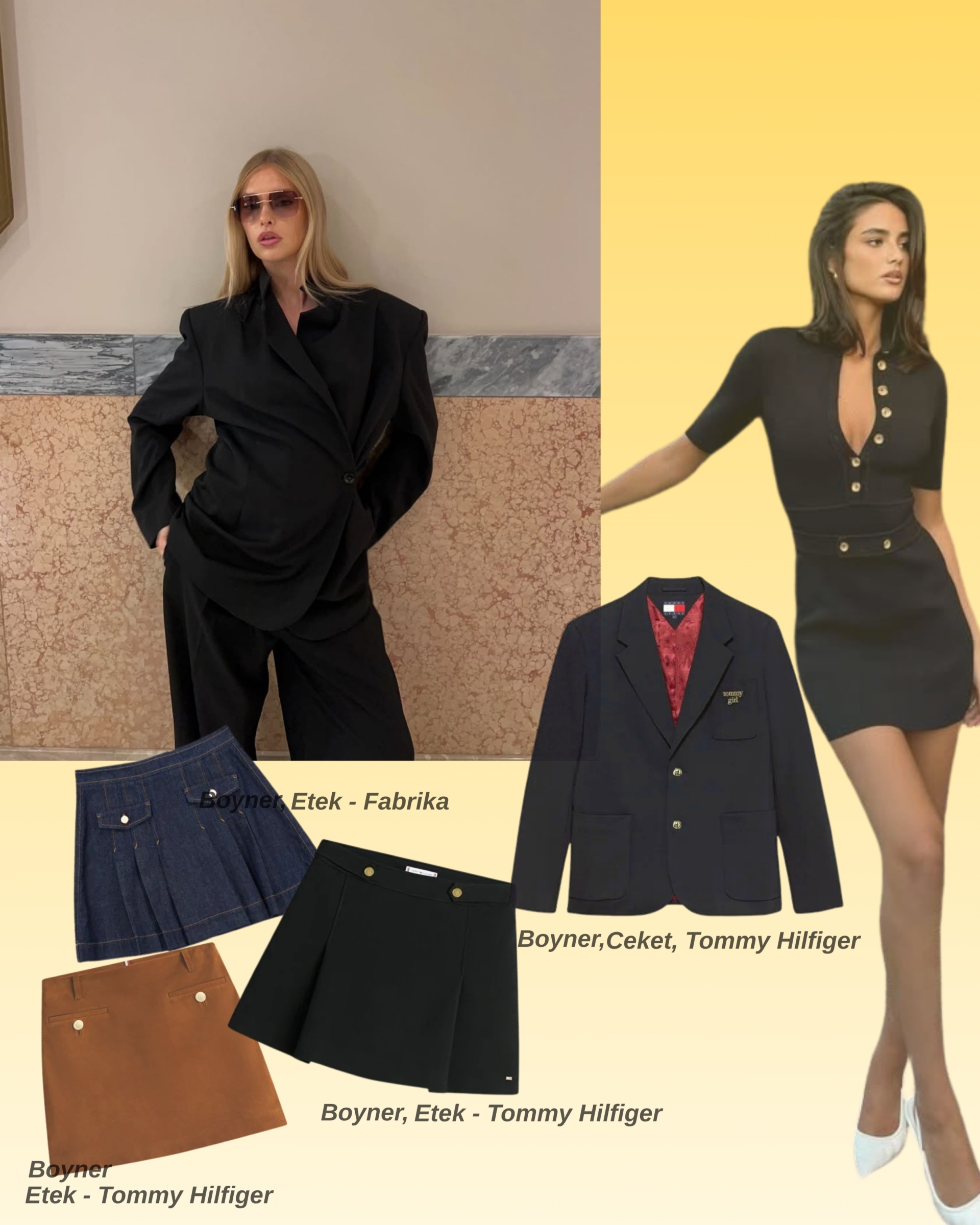 Feminen ve iddialı duruşuyla öne çıkan mini etekler, maskülen blazer ceketlerle birleştiğinde güçlü bir stil kontrastı yaratıyor.