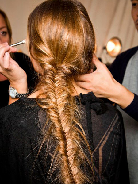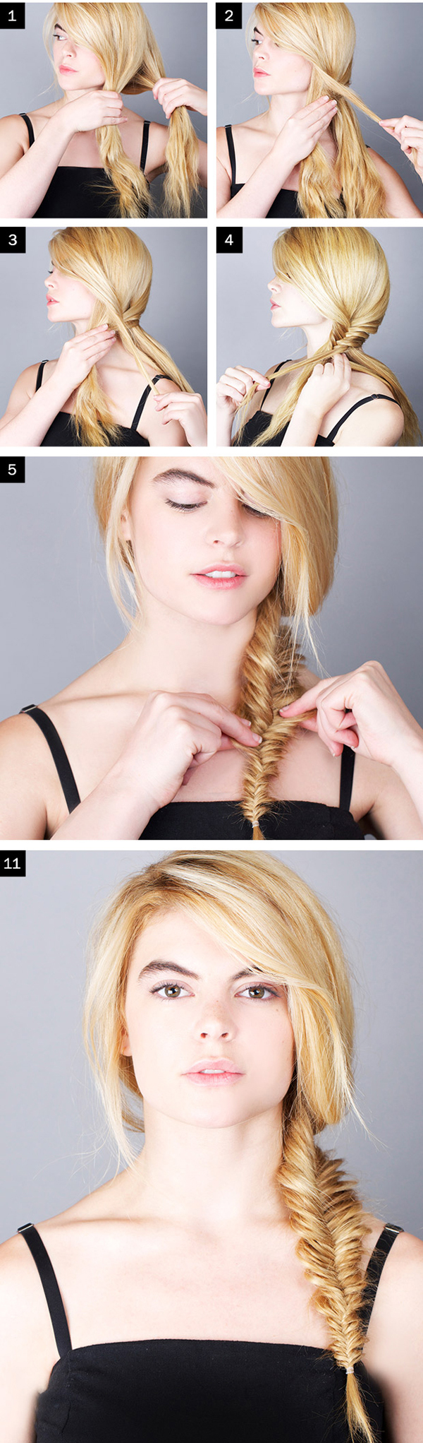 3 & 4. Şimdi ikinci adımı sağ tarafta kalan saçınız için tekrar edin. Bu sefer saçınızı sağ kısmın üstünden dolandırıp sol kısmın altından geçirin. Bu işlemi saçınızı örmeyi bitirene kadar tekrar edip lastik bir tokayla tutturun.