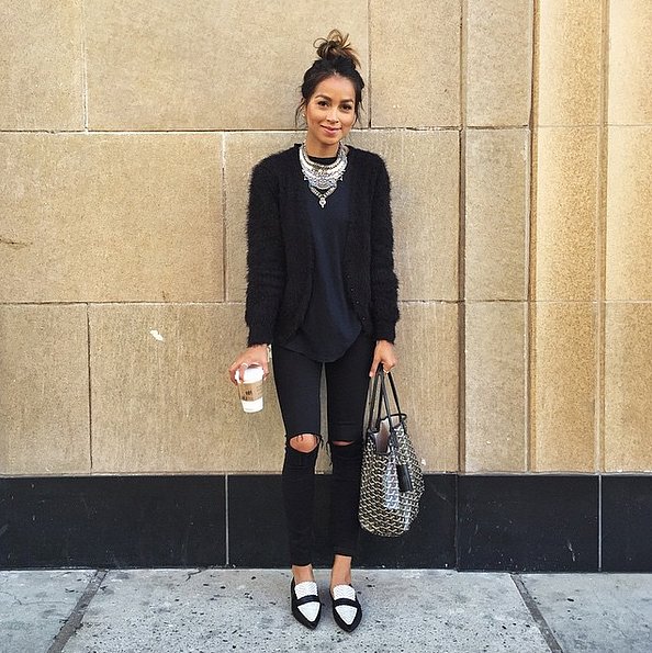 Furry-Cardigan-Distressed-Jeans-Loafers sincerelyjules