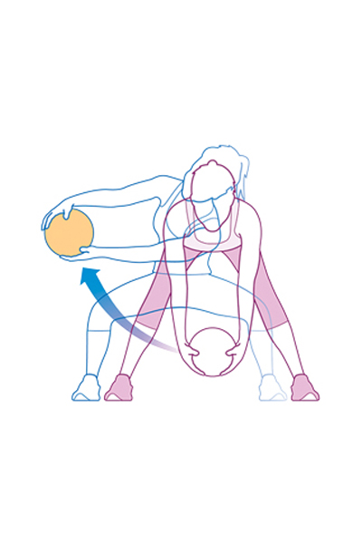 Topu kavrayarak bacakları kalça genişliğinden daha fazla açın ve parmakları dışa doğru döndürün. Belinizi bükerek ve dizleri kırarak, top iki bacağın arasına gelecek şekilde eğilin, vücudun yere paralel olmasına dikkat edin. Sağa doğru yaylanarak topu omuz hizasına getirin ve omurgayı sağa döndürün. Sonra da aynı hareketi diğer tarafa dönerek uygulayın. Yorulana kadar devam edin.