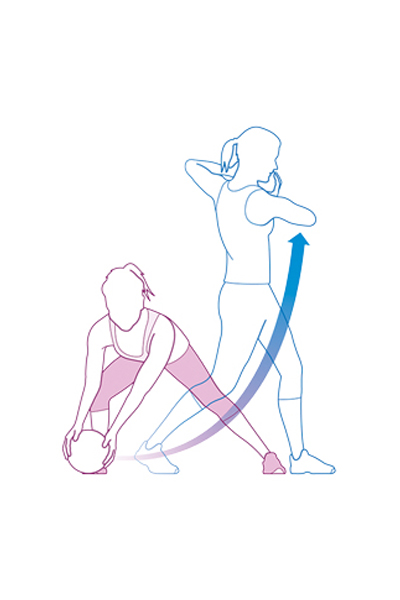 Topu kavrayarak bacakları kalça genişliğinden daha fazla açın ve dizleri hafifçe kırın. Topu göğüs hizasında tutun. Ayağınızı 45 derece dışa döndürerek sola doğru bir adım atın. Vücudunuzu belden bükerek topu ayak parmağınızın ucundaki bir noktaya koyun. Tekrar kalkın ve aynı hareketi sağa dönerek uygulayın. Bu egzersizi, vücudun yeteri kadar çalıştığına emin olana kadar tekrarlayın.
