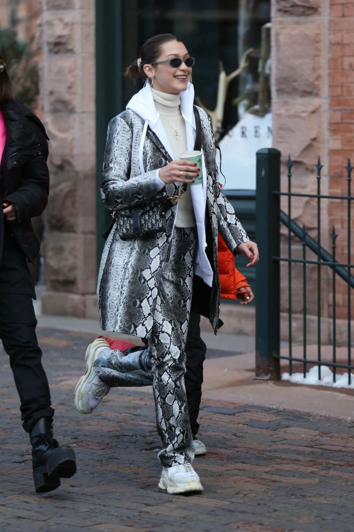 Aspen’de krokodil bir pantolon-ceket takımını tercih eden Hadid; Derek Zoolander estetiğini bize geri getirdi!