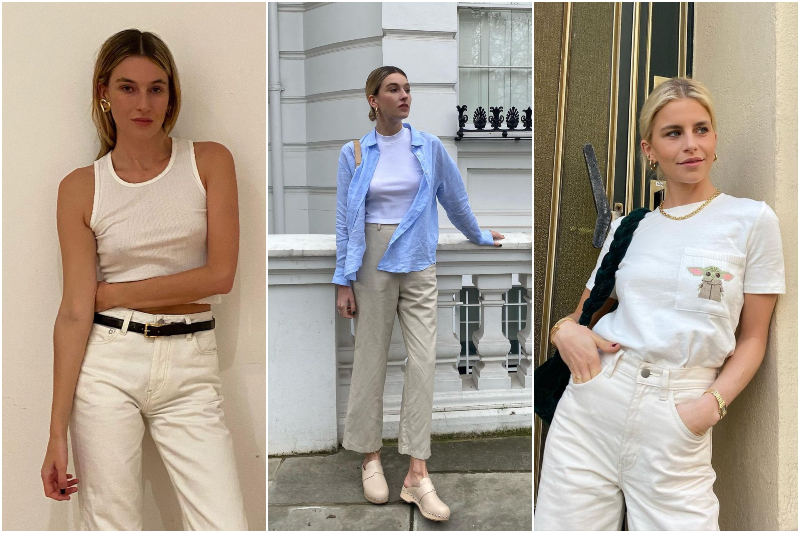 En sevdiğimiz beyaz kombin önerilerinin başında gelenlerden biri de; beyaz tişört ve beyaz pantolon eşleşmesi. Tepeden tırnağa zarif ve ışıltılı bir görünüm için siz de listenize eklemelisiniz. Sadece beyaz değil, krem rengi pantolonlarla da şık duracaktır.