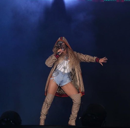 Leopar desenli bir görünümden sonra beyaz kristal süslemeli blazerla sahneye ç?kan Beyonce son olarak da ba?tan a?a?? bir Gucci k?z? oldu.