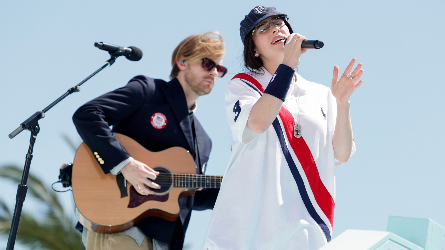 Kardeşi ve müzik yapımcısı Finneas ile birlikte sahne alan Eilish, mavi ve kırmızı çizgilerle süslenmiş Ralph Lauren polo tişört, haki renkte kargo şort ve Nike spor ayakkabı giydi. Eilish stilini optik gözlükleri ve şapkasıyla tamamladı.