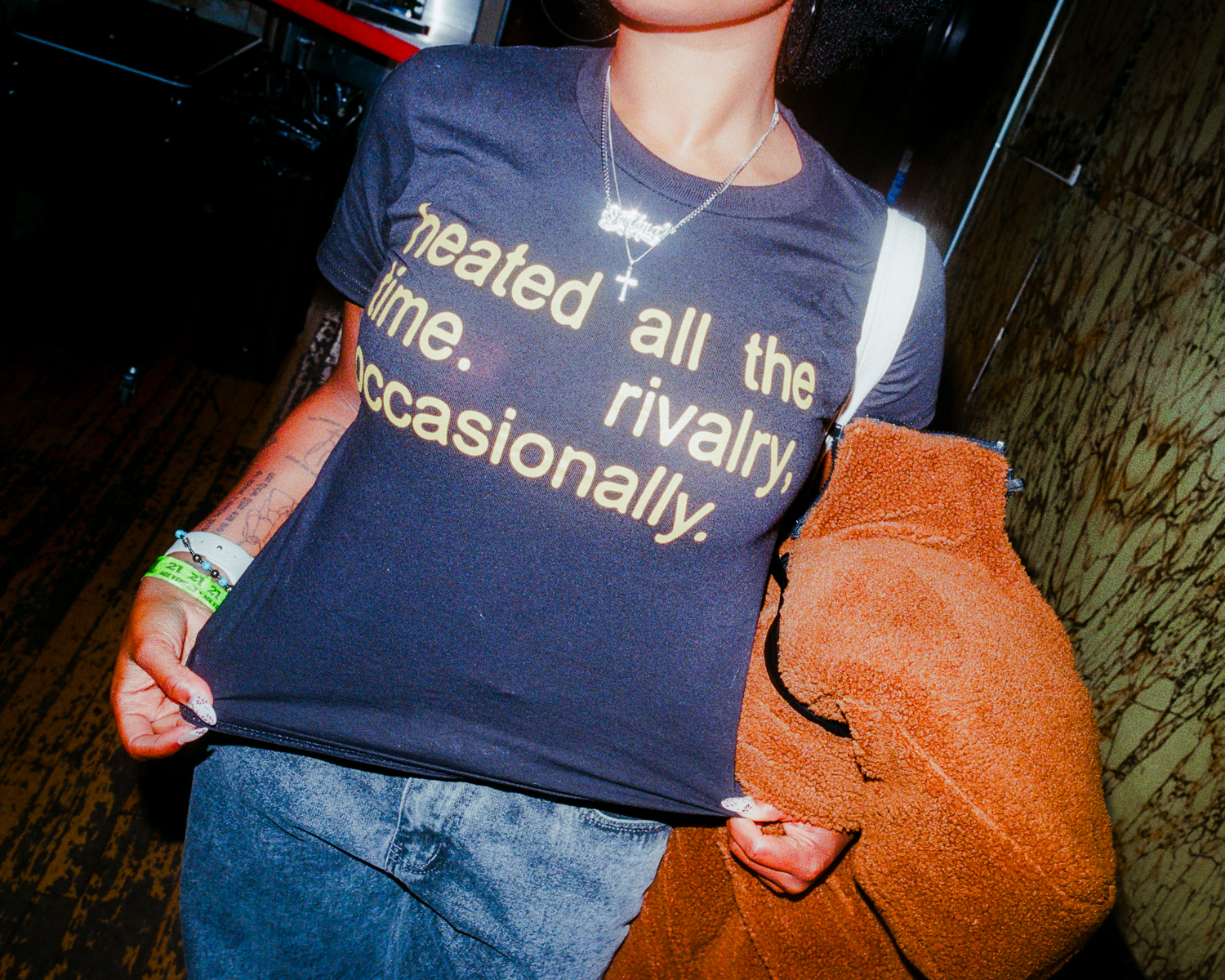 “Heated RivalRave”in bir topluluğa ev sahipliği yaptığından bahsettim. Peki topluluk kimlerden oluşuyor? Partide ABBA’dan Bad Bunny’ye uzanan bir yelpazede çalınan şarkılar her yaştan seyircinin hedeflendiğini gösterse de partiye katılanların ezici çoğunluğu üniversite öğrencisi kadın+’lardan oluşuyordu. Bu demografik yapının doğal olarak ortaya çıkardığı bir rahatlık ortamını gözlemlediğimi not etmem gerekir. Kimse hem New York’ta hem de İstanbul’da katıldığım çoğu partideki gibi birbirini görmezden gelmedi, kimse etrafına soğuk titreşimler yaymadı. Aksine herkesin sanki tek amacı eğlenmek ve bunu yaparken başkalarının eğlencesine gölge düşürmemekti. Ayrıca neredeyse her partideki sağlamcı duruş bu partide yoktu. Mesela kimi sandalyeler yürüme ve ayakta durma zorluğu olanlara ayrılmıştı. Böyle küçük ayrıntıların düşünülmüş olması partilerin sadece eğlenilecek değil, bir şeyleri hatırlayacak, öğrenecek yerler olduğunu yeniden anlamamı sağladı.