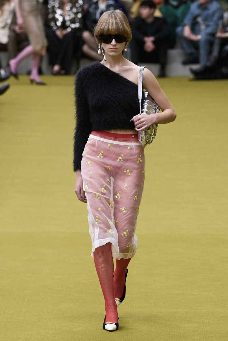 Lidersiz ekip, Tom Ford döneminin 90’ların ince terziliği ve Alessandro Michele’in eksantrik stilleri gibi geçmiş Gucci koleksiyonlarından tarihsel ipuçlarını tasarımlara yansıttı ve bunları modern bir mercekle yeniden yorumladı.