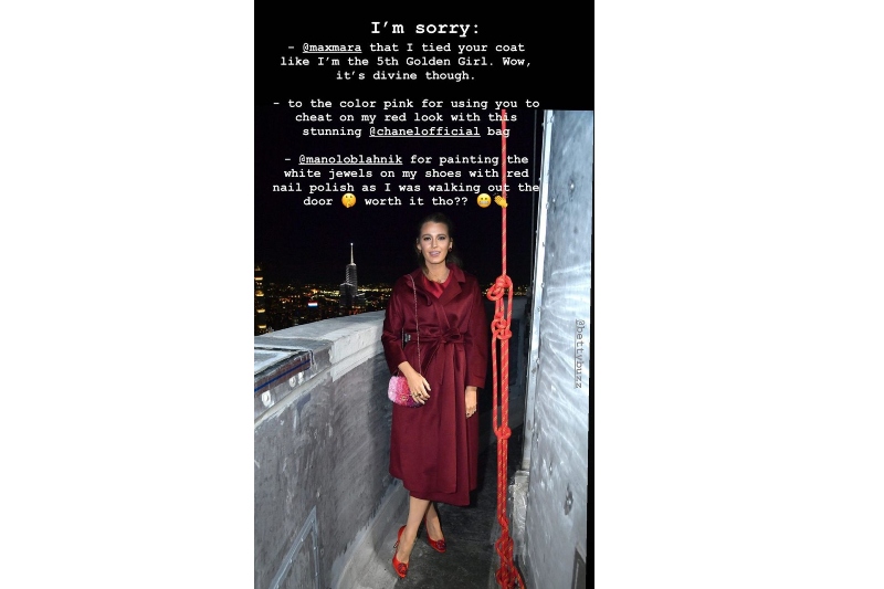 Lively ayrıca Max Mara marka paltosunu 5th Golden Girl gibi bağladığı için ve kırmızı rengi aldatmak için kullandığı Chanel çantasının pembe renginden “özür diledi.”