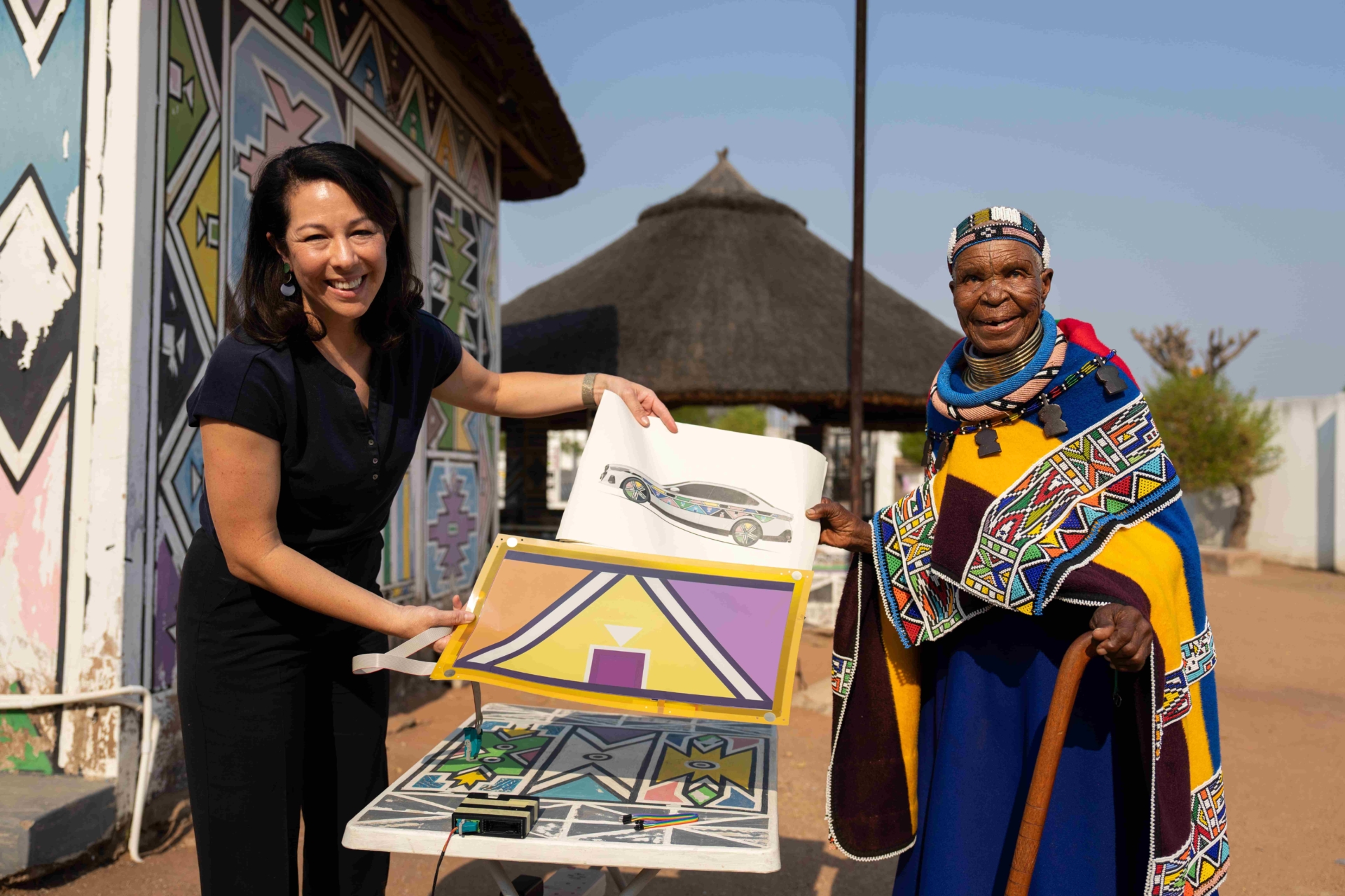 BMW i5 Flow NOSTOKANA’da, BMW Group’un en yeni renk değiştirme teknolojisini kullanılıyor. Elektrik yüklerine duyarlı E Ink film teknolojisi sayesinde, aracın yüzeyi sürekli farklı renklerle hareket ediyor. Bu teknoloji, Mahlangu’nun sanatını dinamik bir boyuta taşıyor ve eserin her an yeni bir görünüme kavuşmasını sağlıyor. E Ink teknolojisinin uygulayıcısı BMW Group’un Açık İnovasyon Araştırma Mühendisi Dr. Stella Clarke, bir otomobilin renk değiştirme konseptinin fikir aşamasında olduğu süreçte Mahlangu’dan aldığı ilhamla bunu gerçeğe dönüştürerek, projede sanatçı ile birlikte çalıştı.