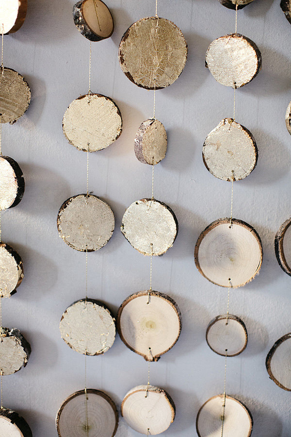 Tahta parçalarını resimdeki iple sarkıtlar haline getirerek etkileyici bir arka fon oluşturun. DIY-Branch-Slice-Backdrop
