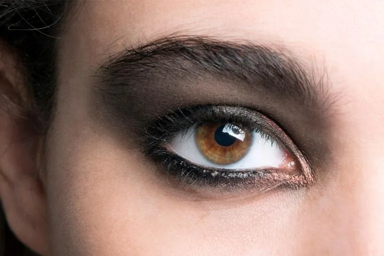 Kaşlara dek uygulanmış kömür siyahı ve göz pınarında bakır renginin kontrastı